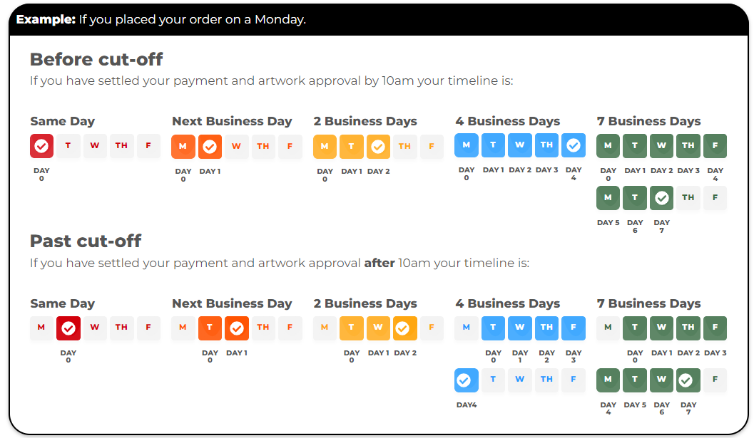 To allow for adequate planning, each service has a 10am cut-off & 1pm for your job to hit production. This requires